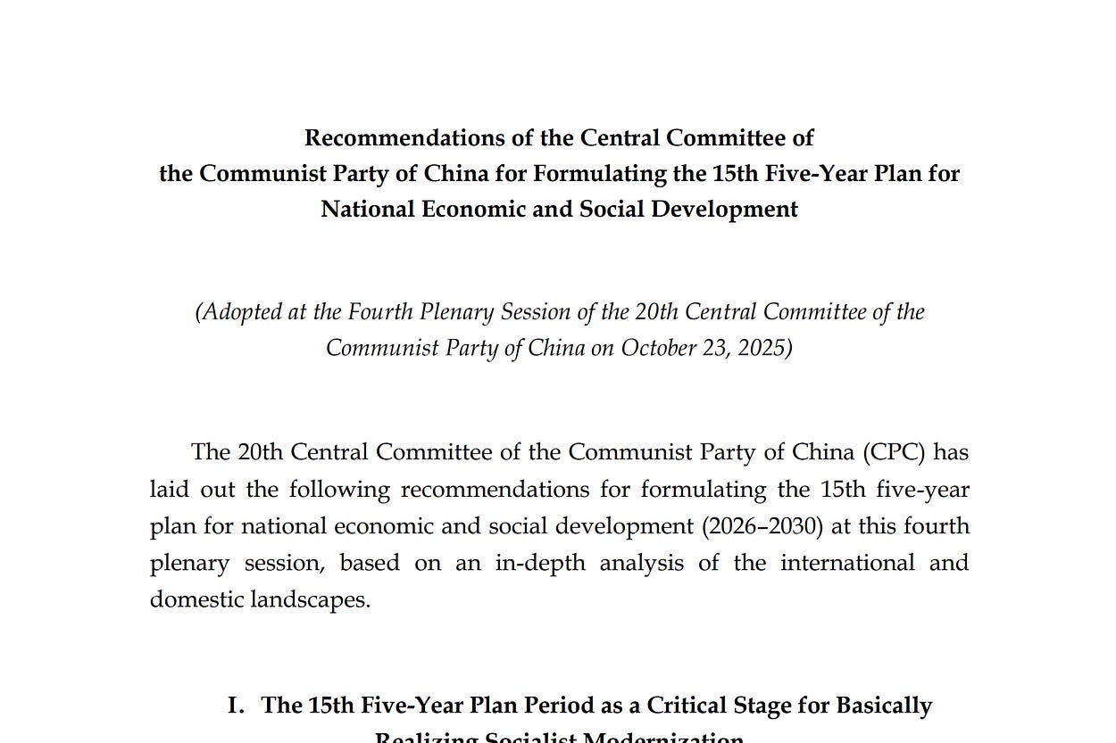 Full Text: Recommendations of the Central Committee of the Communist Party of China for Formulating the 15th Five-Year Plan for National…