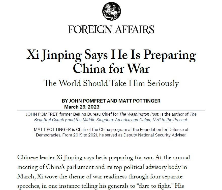 Today's newsletter focuses on an article authored by Matthew Pottinger and John Pomfret for Foreign Affairs titled "Xi Jinping Says He Is Preparing China for War." We have carefully examined the arguments presented in the article and will share our discoveries here.