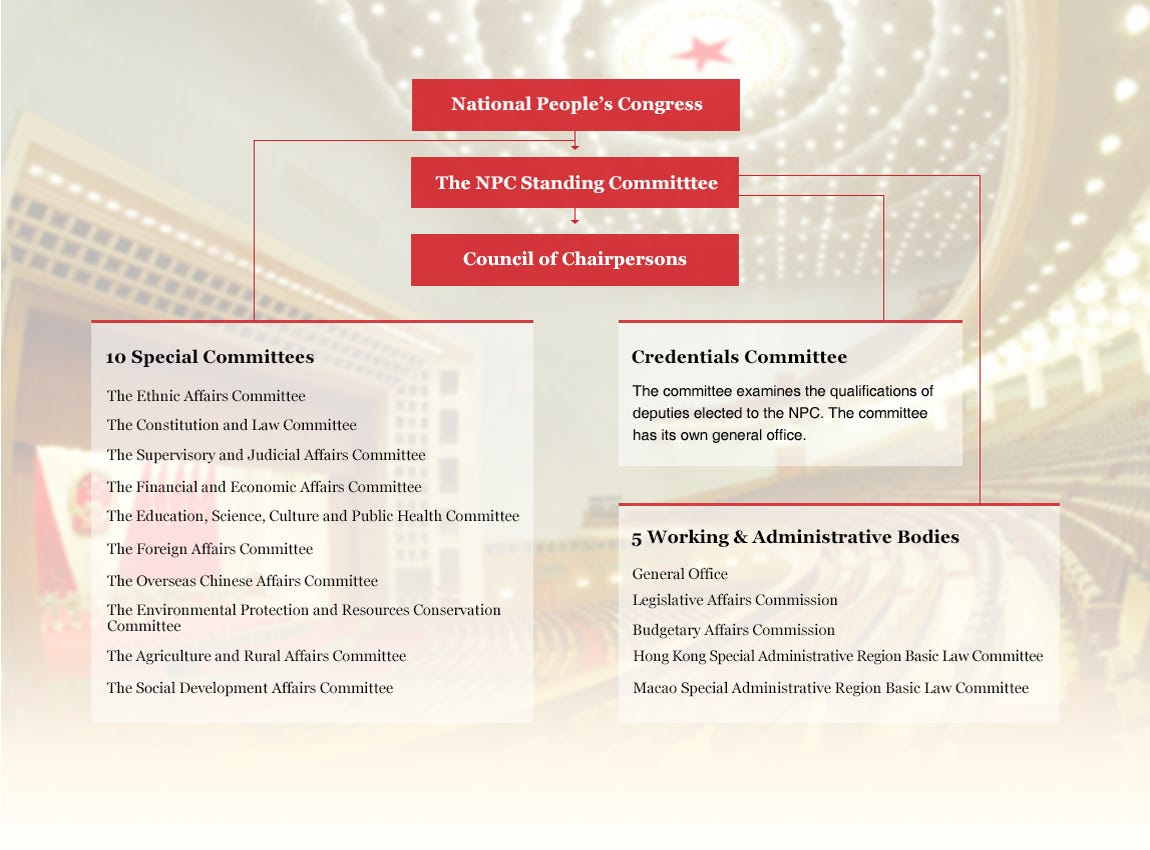 Another important part of the NPC is 全国人大常委会委员长会议 the Council of Chairpersons, which constitutes the chairperson, vice chairpersons, and the secretary general and handles the important day-to-day work of the National People's Congress Standing Committee.