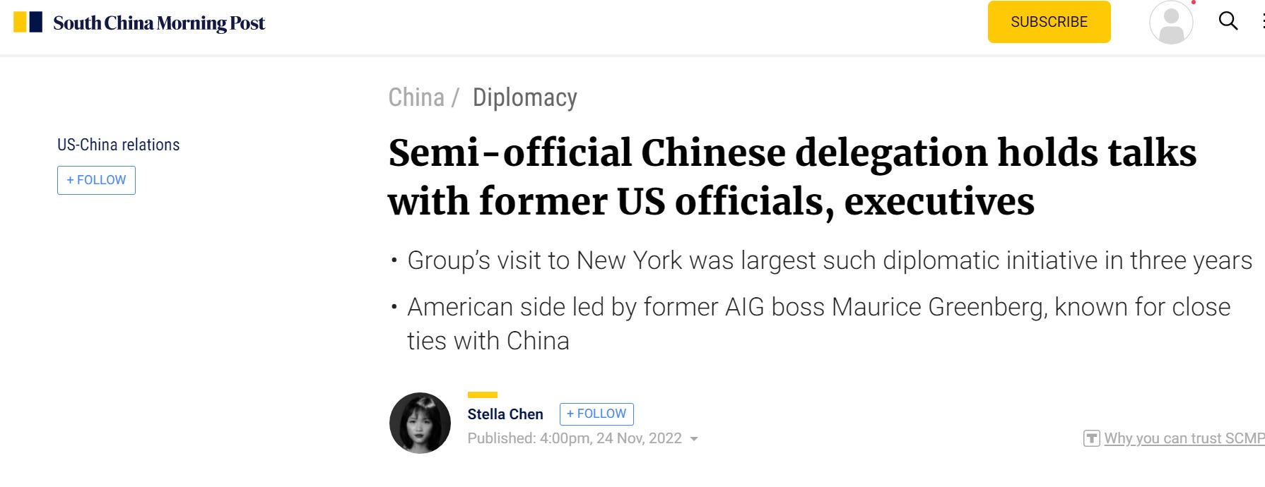 The visit was viewed as a positive response to U.S. business legend Maurice R. Greenberg's call for restoring trust between the two countries, and many saw it as part of efforts by both sides to de-escalate bilateral tensions.