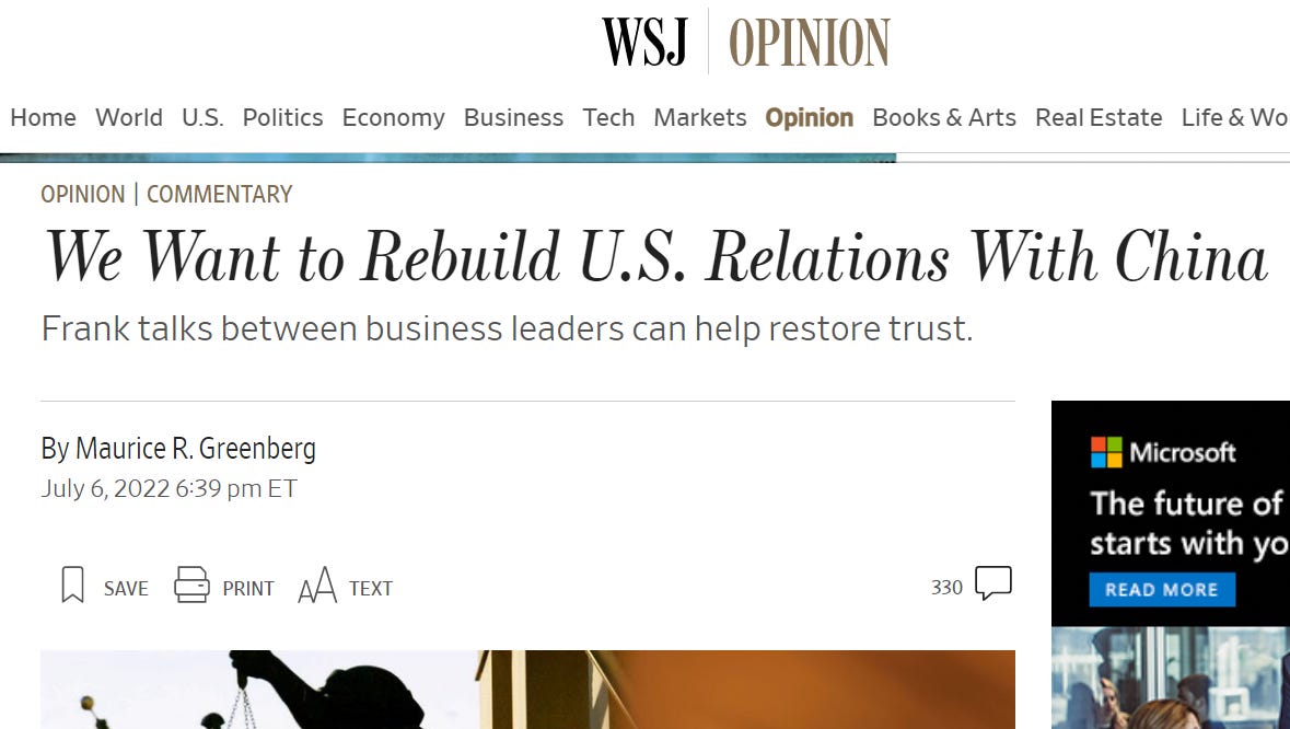 So in this difficult time for China-US relations, Mr. Greenberg can play a very unique role. First, he has the courage to speak up. Second, he has the foresight to envisage a future for the bilateral relations. Third, he has influence and at least the channel to let the decision-makers know their ideas.