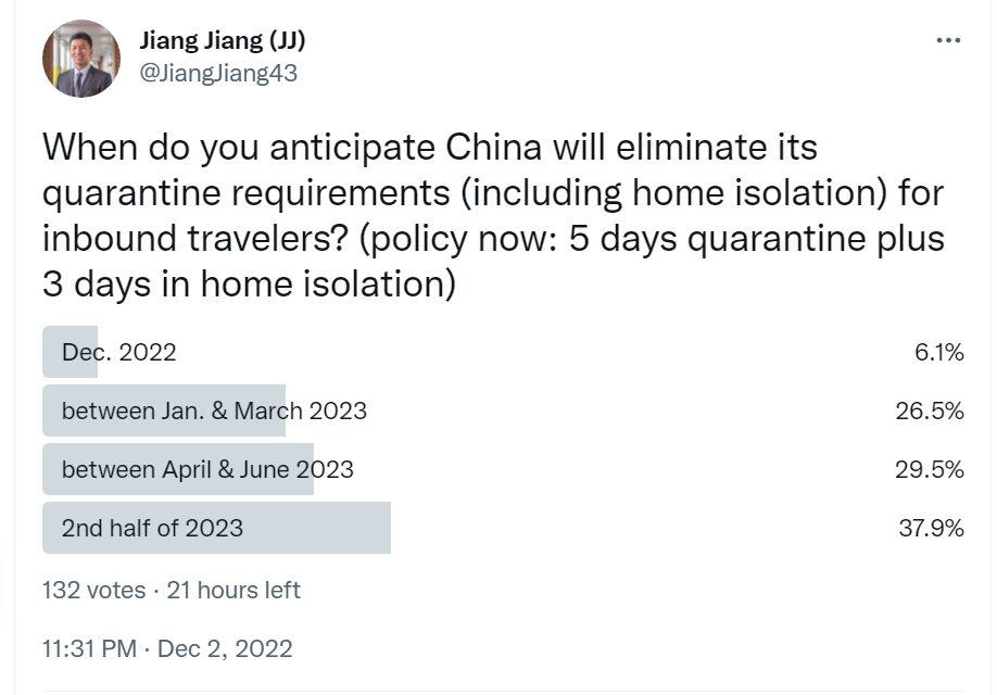 However, almost all of the optimized measures in terms of travel restrictions are currently focused on domestic trips. So far, there is no indication of when China will lift and relax its requirements for inbound travelers. Your Ginger River conducted a quick Twitter poll to seek opinions regarding the timing of the lifting of restrictions on inbound travelers: