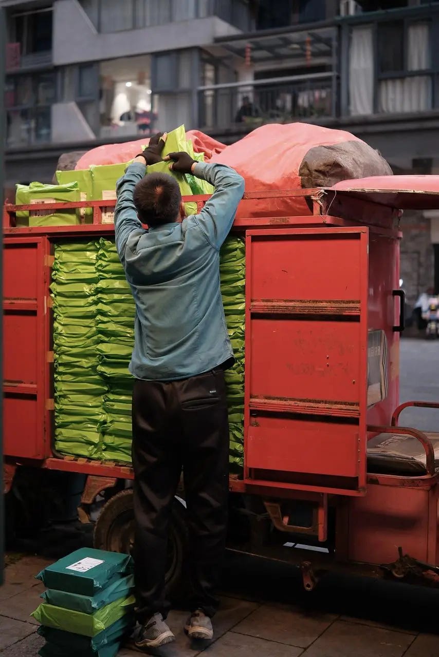 “Pine Tree” is Wild Mountain’s third courier. In his thirties, with high cheekbones, he is usually quiet. Pine Tree is his WeChat nickname, and people call him that. He is meticulous: when he sees that parcels contain books, he stacks them neatly in woven bags to prevent damage. Staff member Yuhe and the couple therefore show him extra warmth—offering water and helping load packages.